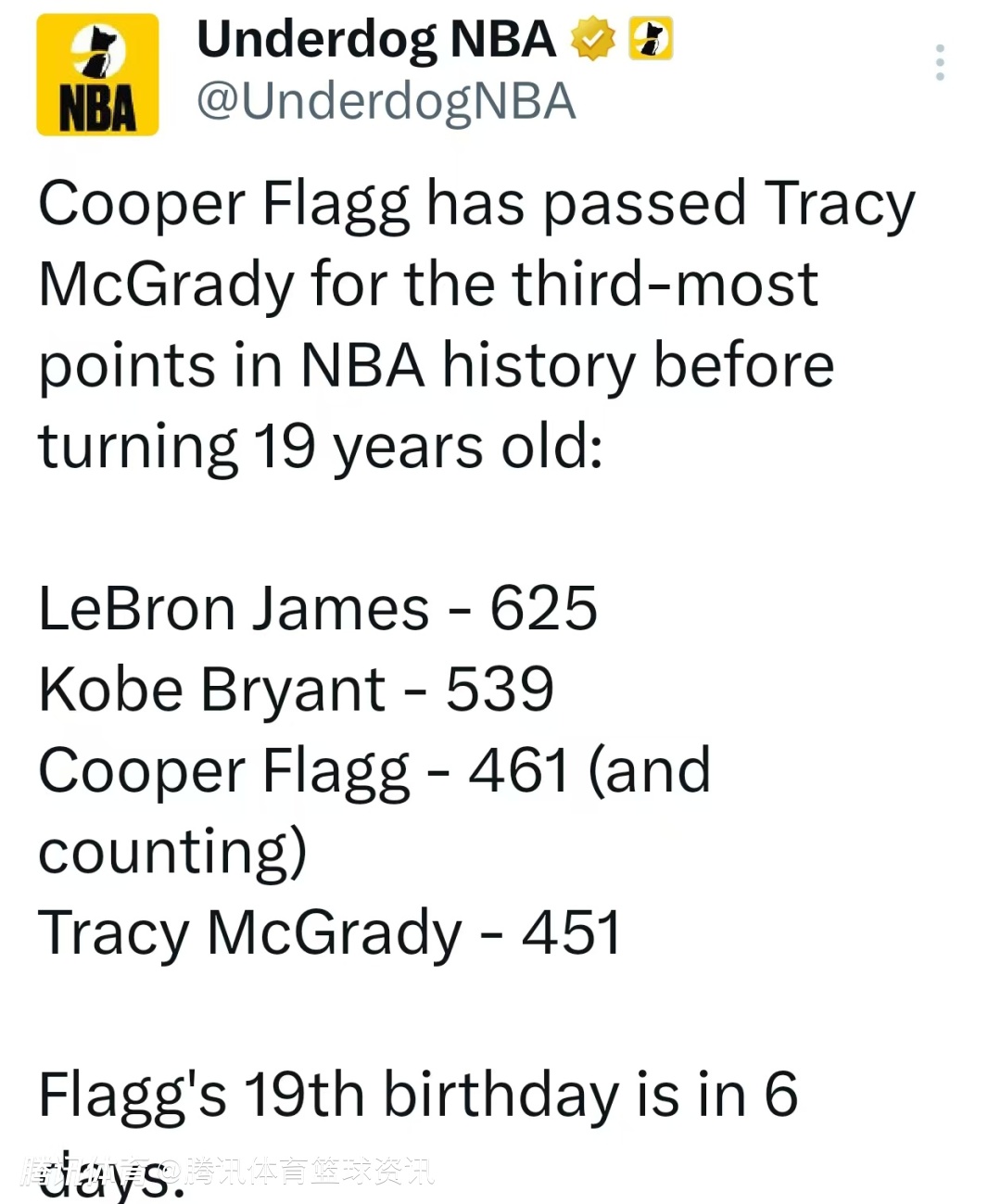 另据数据统计显示,弗拉格在年满19岁前的得分超越同期麦迪,跻身NBA历史第三: