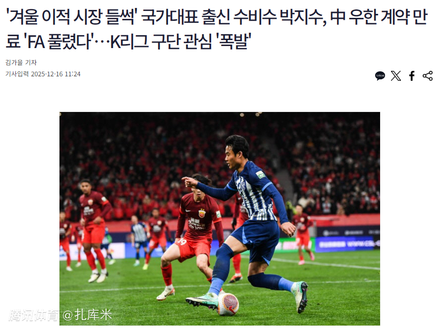 2025-12-16 12:00根据韩国媒体《朝鲜体育》的报道,与武汉三镇合同即将到期的前韩国国脚朴志洙,除了引起山东泰山的注意之外,韩国K1和K2多支球队均有意将其签下。