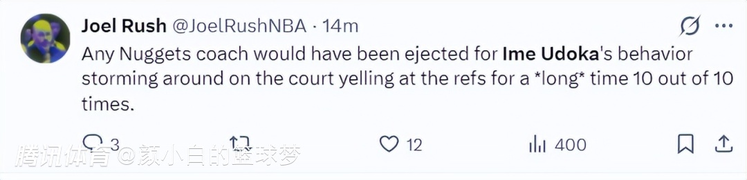 但掘金记者乔尔-纳什则这样发声:如果是掘金队的主教练在场上横冲直撞,对阵裁判一顿怒骂,裁判肯定会驱逐他。乌度卡朝着裁判的输出时间很长,这种情况十有八九是该被驱逐的。