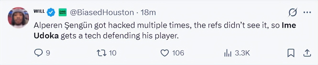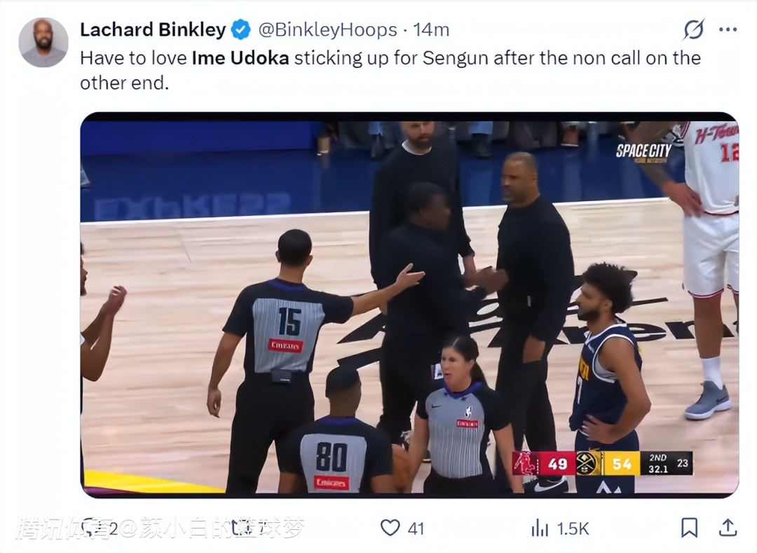火箭记者兰德里-宾克利晒出申京、乌度卡两人被裁判吹罚技术犯规的瞬间,他写道:不得不佩服乌度卡为了球员的举动,在裁判没有任何表示的情况下他直接挺身而出。
