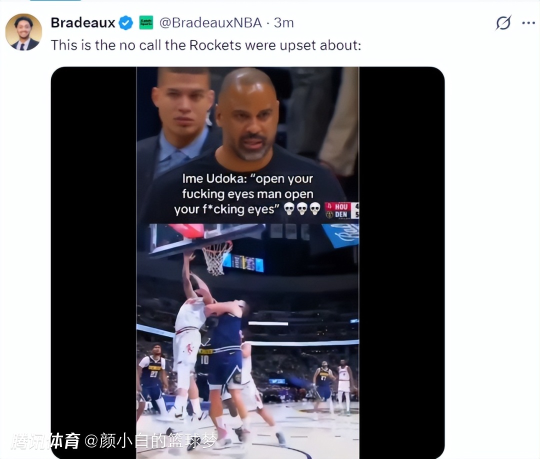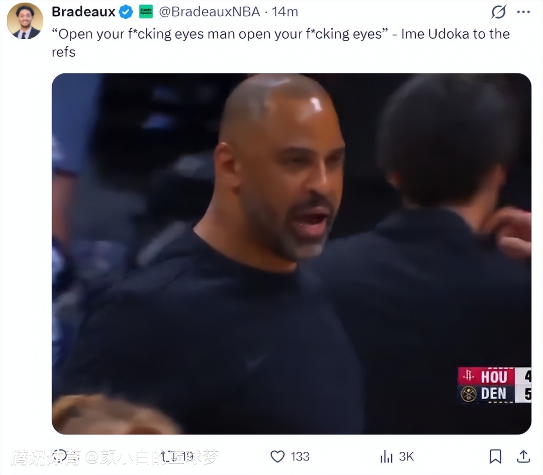 火箭记者Bradeaux晒出了乌度卡爆粗口的瞬间:FXcking eyes!睁开你们那该死的眼睛,伙计!睁开你们那该死的眼睛吧。