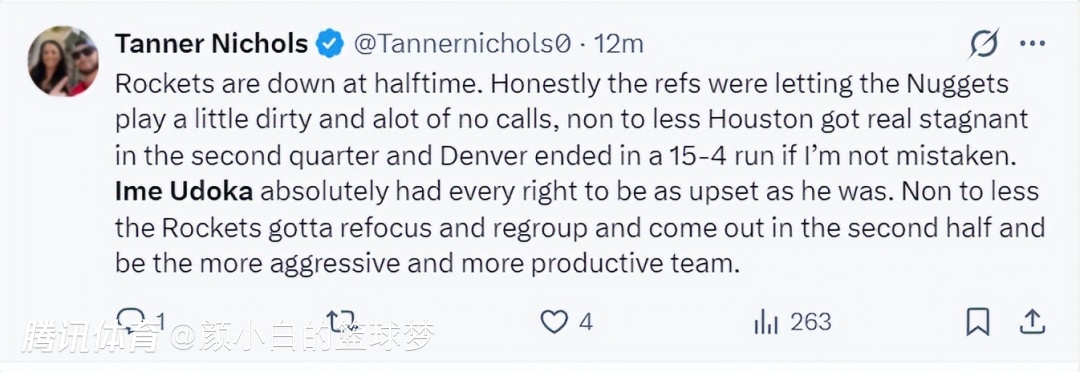 NBA记者Tanner Nichols:说实话裁判们的吹罚过于宽松多次漏判,结果掘金凭借裁判的偏向打出15-4完成反超,完全理解乌度卡的愤怒。