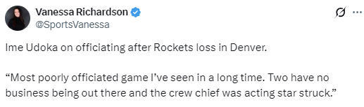 2025-12-16 14:10北京时间12月16日,NBA常规赛继续进行,火箭队经过加时苦战,125-128不敌掘金队。赛后,火箭队主教练乌度卡接受采访,谈到了本场比赛的吹罚。