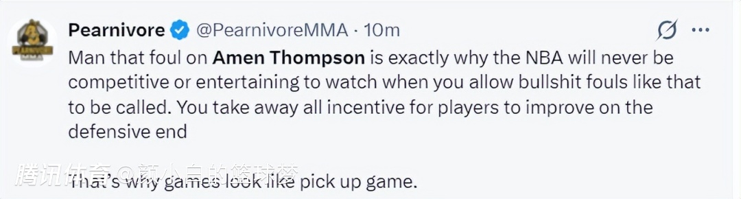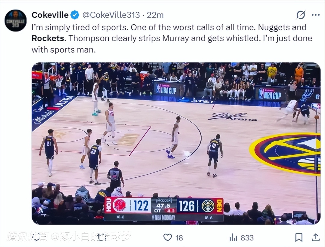 美媒Cokeville晒出了阿门抢断穆雷的一幕,这个球就是裁判吹罚犯规送穆雷两罚那个球,他写道:我对体育已经失望了,这是有史以来最糟糕的吹罚之一,阿门明显抢断成功,但裁判却吹了犯规。我对这项运动已经失去了兴趣,再也不想看了。