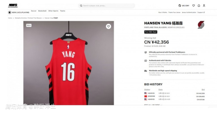 2025-12-16 16:40在12月8日开拓者客场96-119输给灰熊的比赛,杨瀚森迎来NBA生涯首次首发比赛,该场比赛他贡献4分5篮板2助攻。如今杨瀚森该场比赛首发穿的球衣,已经被拍卖最终成交价是42356元,展现出不菲的商业价值。