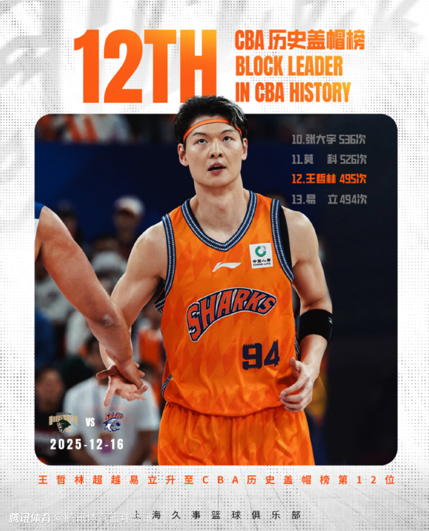 在今晚主场对阵南京天之蓝的比赛中,王哲林在第2节送出个人第2次盖帽,CBA生涯盖帽总数上升至495次,超越易立的494次,升至CBA历史盖帽榜第12位!