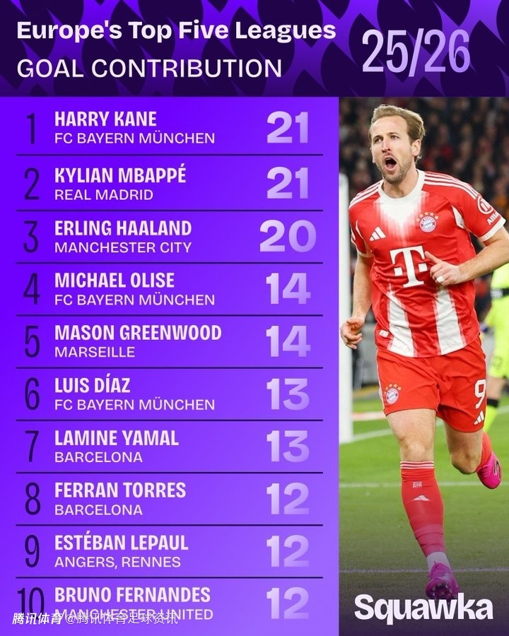 在2025-26赛季五大联赛中,凯恩和姆巴佩的进球加助攻数同为21次。其中,效力拜仁的凯恩平均每52分钟便能制造一粒进球,而皇马前锋姆巴佩的平均用时为69分钟。