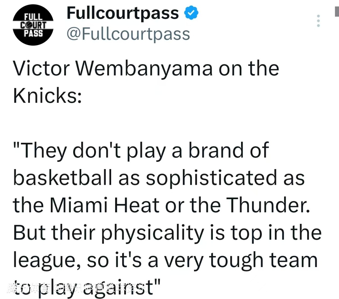 文班亚马:尼克斯打法不复杂但对抗强度联盟顶级 想击败他们绝非易事