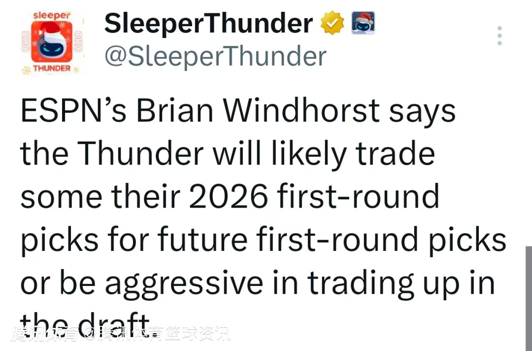 2025-12-17 06:40北京时间12月17日,ESPN名记Brian Windhorst在和网友互动时表示,雷霆队大概率会将其持有的部分2026年首轮签交易出去,换取未来年份的首轮选秀权,或是在选秀大会中主动向上交易提升顺位。