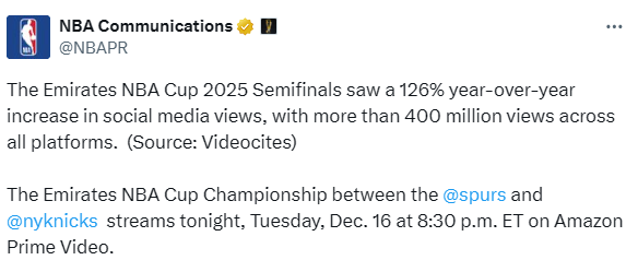 热度爆棚!官方: NBA杯半决赛全平台播放量破4亿 社媒播放量同比涨126%