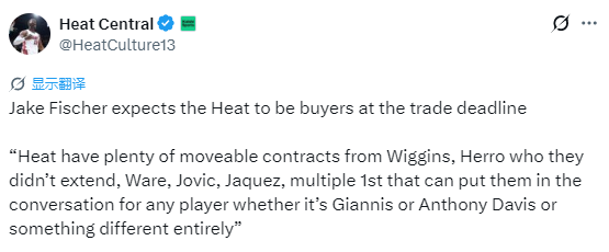 Fischer说道:“我觉得热火队也具备很强的竞争力。几周前他们的排名曾冲到东部第四,但此后战绩有些起伏。不过热火手握不少可用于交易的合同,既有维金斯的合同,也包括今年秋天未完成续约的希罗。队中还有约维奇、韦尔等球员,外加多个首轮选秀权。理论上,这些筹码足以支撑他们去争取任何球星,不管是字母哥、我们之前聊到的安东尼-戴维斯,还是其他类型的球员都有机会。”