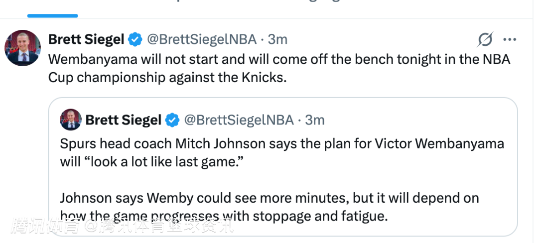 马刺主帅:NBA杯决赛文班亚马继续替补出战 出场时间或增加