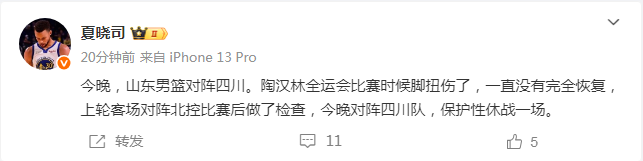 如今根据夏晓司报道:“今晚,山东男篮对阵四川男篮。陶汉林全运会比赛时候脚扭伤了,一直没有完全恢复,上轮客场对阵北控比赛后做了检查,今晚对阵四川男篮,保护性休战一场。”