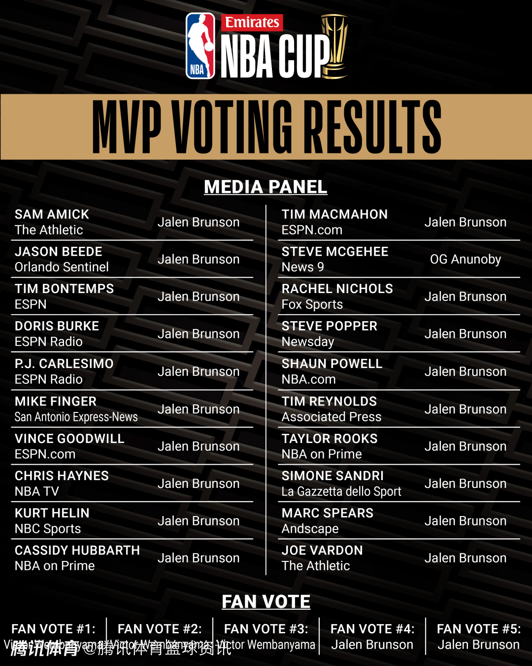 赛后,NBA官方公布了MVP投票结果,布伦森几乎全票当选,获得媒体评审团中的19票,队友阿奴诺比获得1张选票。
