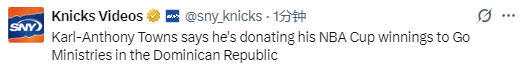 唐斯表示,他计划将赢得NBA杯所获得的53万美元奖金,捐赠给他在多米尼加共和国的基金会,以帮助经济困难的社区和家庭建造房屋。而在走上领奖台时,唐斯曾说道:“哇,衣服上印着‘冠军’的字样,看起来也太赞了吧!”在谈到夺冠感受时,唐斯表示:“我只在乎我们赢下了比赛,拿到了冠军T恤和帽子。这是我一整天都在为之奋斗的目标,也是唯一重要的事。”