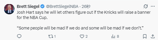 在谈到尼克斯队是否该为NBA杯赛冠军升起一面冠军旗帜时,哈特表示:“不管我们升不升旗帜,都会有人不满。”