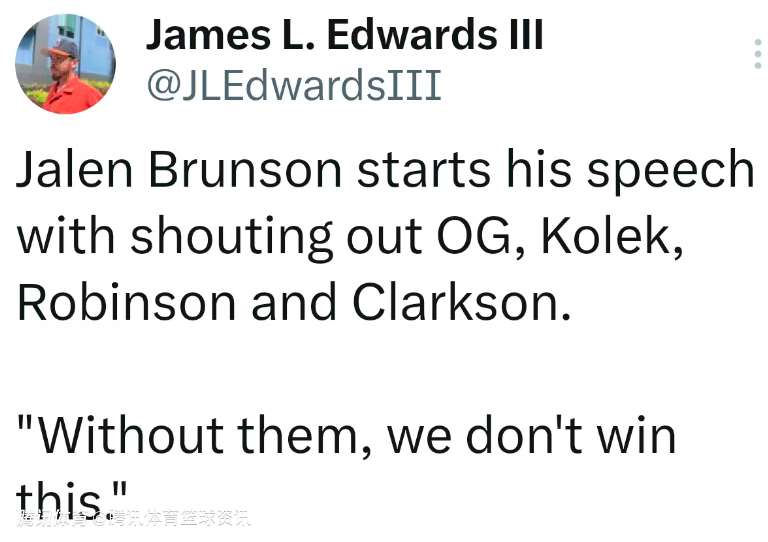 关于队友科勒克的表现,布伦森说道:“他在大场面的表现太亮眼了。真的为他感到高兴,可能就只是一次突破,你们就能看出他平时训练有多拼。我真心为他开心。他的发挥对我们球队帮助太大了,他正是我们需要的那种球员。没错,他就是这么刻苦,真的太为他高兴了。”