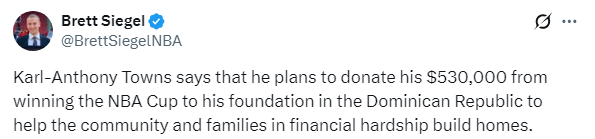 据报道,唐斯将捐出自己NBA杯冠军奖金53万美元,用于帮助家乡多米尼加的儿童们。