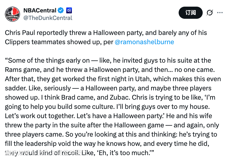 据该记者透露,保罗办了一场万圣节派对,但快船队友几乎没人到场:“早些时候发生的一些事 —— 比如,他邀请队友去看公羊队比赛时准备了套房,还办了场万圣节派对,结果没人来。之后,他们在犹他的首战就输得很惨,这让整件事更让人难过了。”