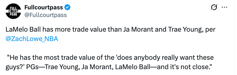 Lowe表示:“在‘真有人想要这些控卫吗’的这几个人里,特雷-杨、莫兰特、三球,三球的交易价值是最高的,而且优势很明显。”