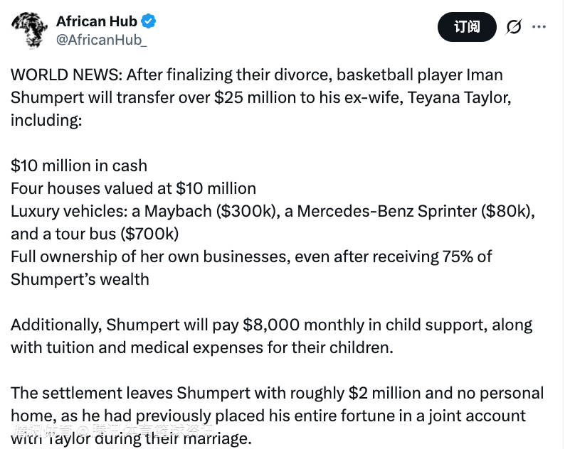 此次财产分割后,香珀特仅剩余约200万美元,且无个人住房——因为他在婚姻期间将全部财产存入了与泰勒的共同账户。