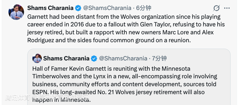 Shams:加内特将重返森林狼担任综合职务 其21号球衣也将退役