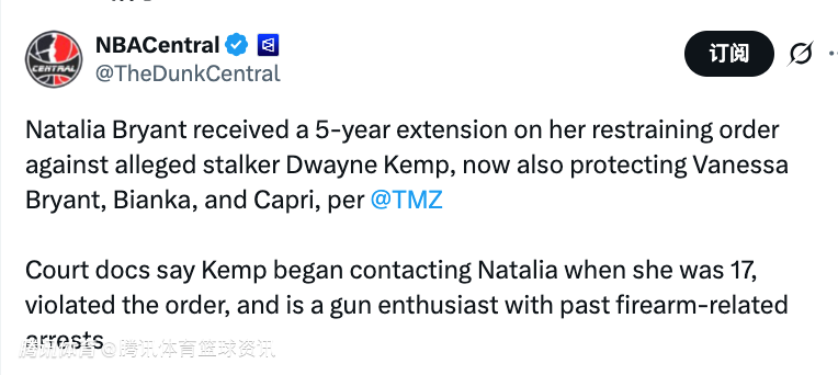 2025-12-19 00:30北京时间12月19日,据TMZ报道,科比大女儿——娜塔莉亚-布莱恩特,成功将针对一名疑似跟踪者的限制令延长五年,且此次禁令的保护范围新增了她的母亲与妹妹。