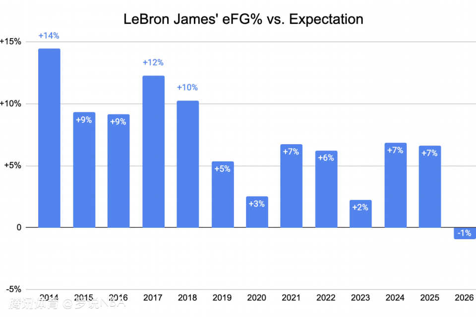 但在2025-26赛季,他的实际投篮效率首次略微低于预期值。