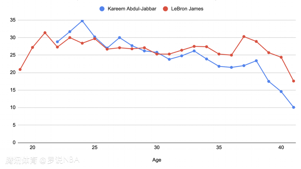对于NBA历史上几乎任何其他球员而言,能征战至40岁以上便已是非凡成就,场均砍下17.6分更是前所未有的表现。此前,在41岁高龄仍能保有得分竞争力的传奇球星是卡里姆-阿卜杜尔-贾巴尔,他在41岁赛季场均贡献10.1分,而这已是其漫长职业生涯末期,状态逐步下滑后的结果。贾巴尔生涯最后一个场均得分24+的赛季,定格在他33岁之时。