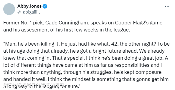 2025-12-19 07:20北京时间12月19日,活塞球星、前状元秀坎宁安在接受采访时,谈及独行侠状元弗拉格的赛场表现,以及自己对这名新秀联盟初体验的评价。