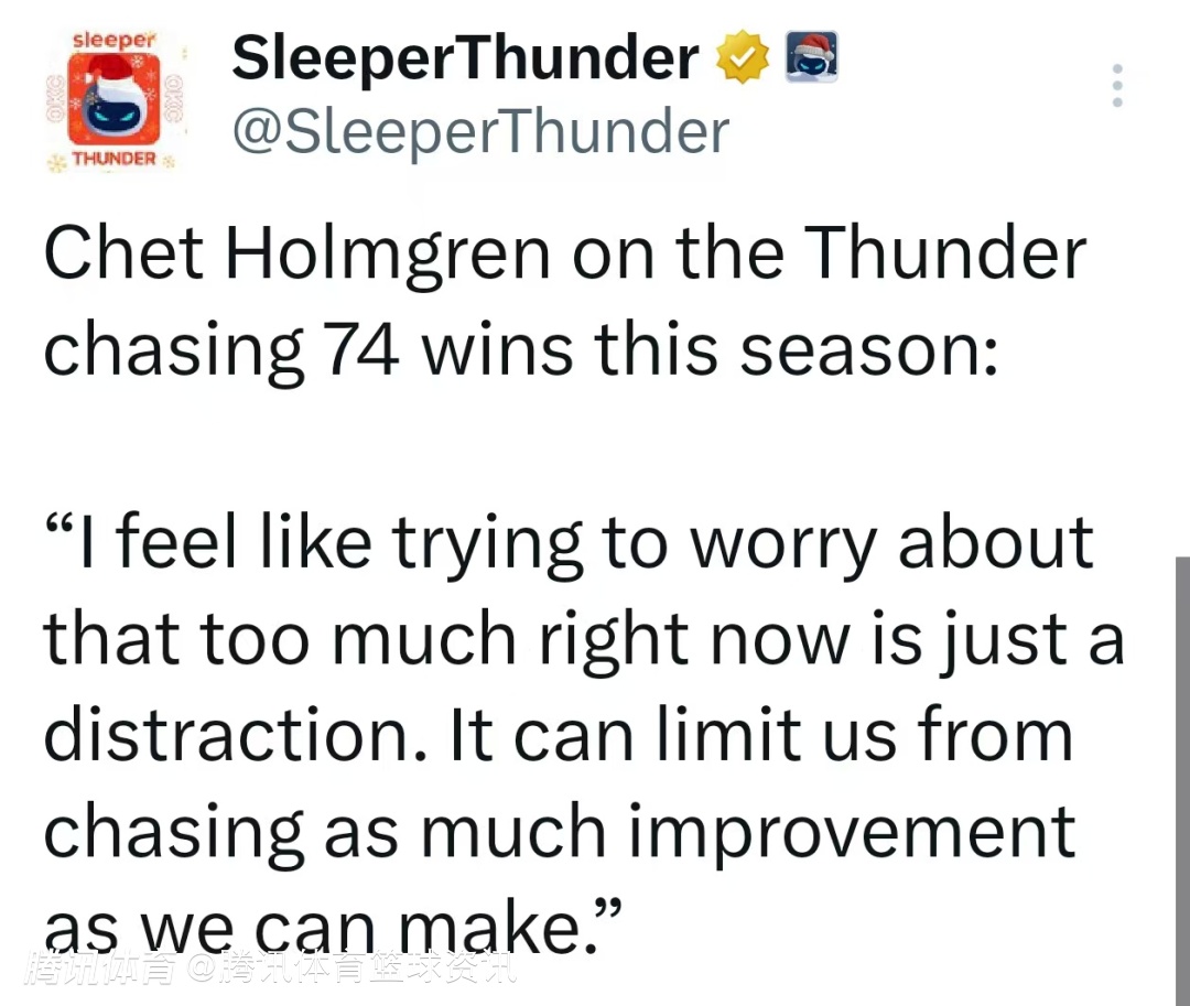 霍姆格伦:几乎没人聊。我们天天琢磨的是“今天怎么比昨天更好”,我认为现在过度纠结这件事,只会分散球队精力,反而会制约我们全力追求更进一步。”