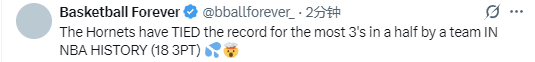 上半场18记三分球!黄蜂追平NBA历史纪录 三球1数据比肩库里