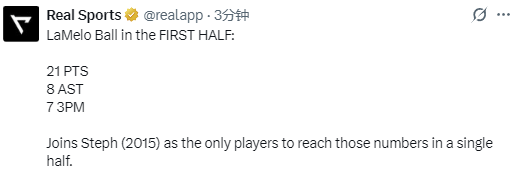 黄蜂队的当家球星拉梅洛-鲍尔上半场三分球9投7中,得到了21分8助攻,根据数据统计显示,鲍尔成为了2015年库里之后,第2位在上半场比赛中就能砍下至少21分8助攻且命中7个三分球的球员。