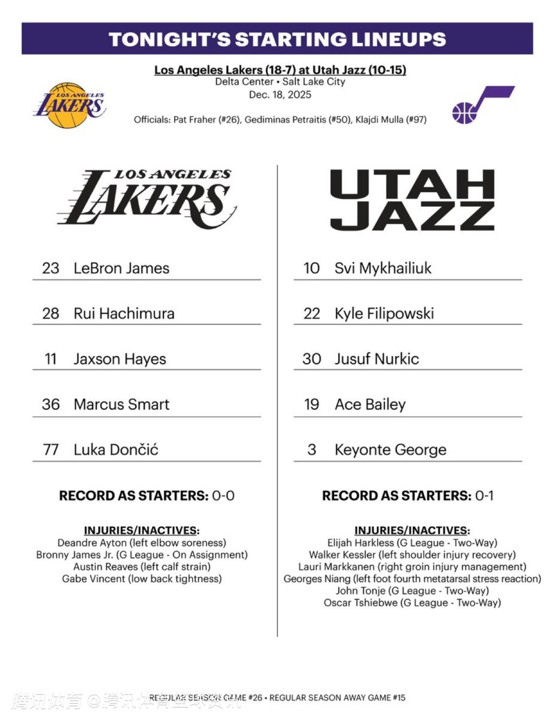 2025-12-19 09:50北京时间12月19日,NBA常规赛继续进行,湖人队对阵爵士队。赛前,双方公布了本场比赛的首发名单。