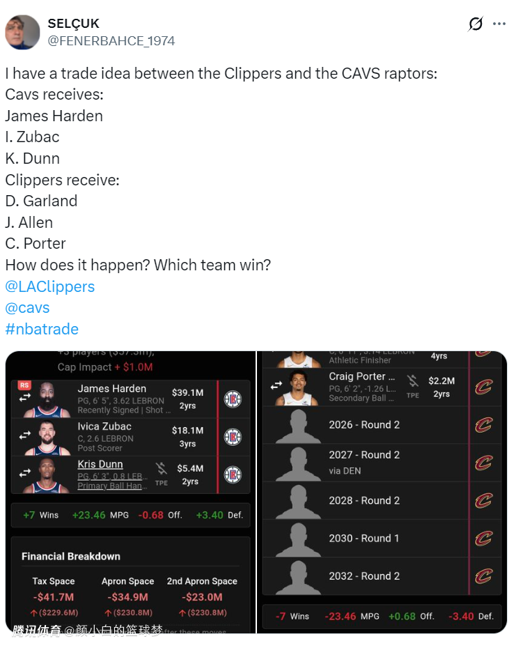 曝哈登陷入交易流言!船媒晒骑士球衣照 美球迷模拟8换3两队大改阵容