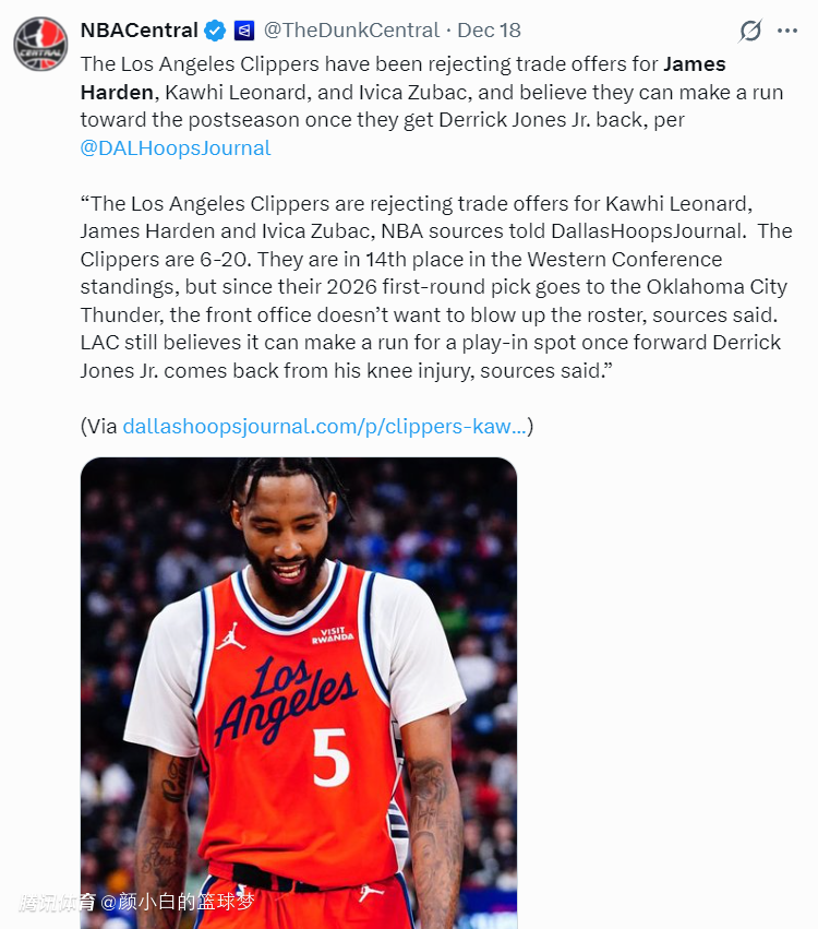 一天之前美媒Hoops的说法是快船拒绝交易祖巴茨、哈登、伦纳德、德里克-琼斯等人,他们觉得等到琼斯复出后快船再进行一些小的修补又会成为西部顶级的球队。这一天过去差距就如此之大?