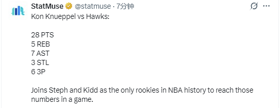 克努佩尔得到28分5篮板7助攻且命中6个三分球,作为一名新秀球员,他单场至少25分5拉板5助攻5+三分球的次数在历史上仅次于斯蒂芬-库里和坎宁安。同时他单场得到28分5篮板7助攻3抢断且命中6个三分球的表现,在新秀球员中除了他之外,只有库里和基德曾做到过这点。
