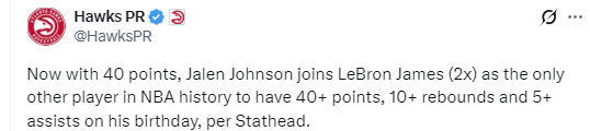 杰伦-约翰逊43分创新高 生日夜砍至少40分10板5助成詹姆斯后第2人
