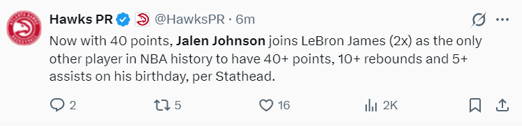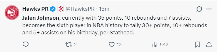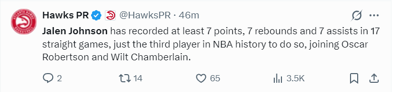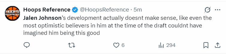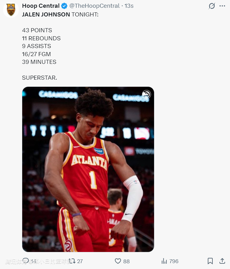 美媒Hoops Reference写道:杰伦-约翰逊的成长经历令人惊叹,及时是他选秀时看好他的那些人都不敢想象他能如此的出色。