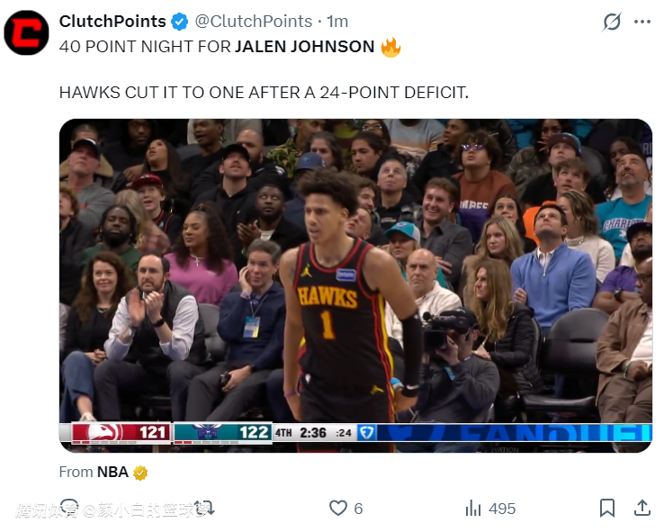 2025-12-19 10:50北京时间12月19日,老鹰126-133惜败黄蜂,这场比赛黄蜂一度领先老鹰24之多,特雷杨的复出并没有让老鹰的进攻更好反而在防守端成为黄蜂提款机,转折点是特雷杨下场以后,新鹰王杰伦约翰逊带队疯狂追分,末节一度缩小到一分只可惜还是功亏一篑。