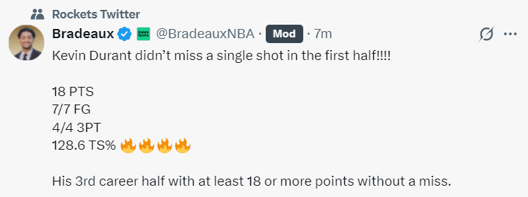 第二节杜兰特只打了8分多钟,他看阿门、申京、谢泼德发挥都不错主动让渡球权,第二节只有2次出手全部命中,半场7中7,三分4中4,拿到18分4篮板1助攻2盖帽,真实命中率高达128.6%,杜兰特生涯第三个半场拿到至少18分且0失误。