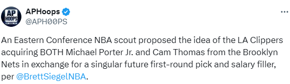 2025-12-20 07:20北京时间12月20日,根据记者Brett Siegel的报道,一位NBA东部联盟的球探提出方案:快船队可以用一个未来首轮签,外加一名薪资匹配球员作为筹码,从篮网队同时得到小迈克尔-波特与托马斯。