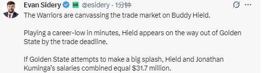 该记者写道:“金州勇士队正在交易市场兜售巴迪-希尔德。巴迪-希尔德的出场时间创下职业生涯新低,看起来会在交易截止日前离开金州勇士队。如果金州勇士队想要达成一笔重磅交易,薪资合计为3170万美元的希尔德与乔纳森-库明加(可能成为筹码)。”