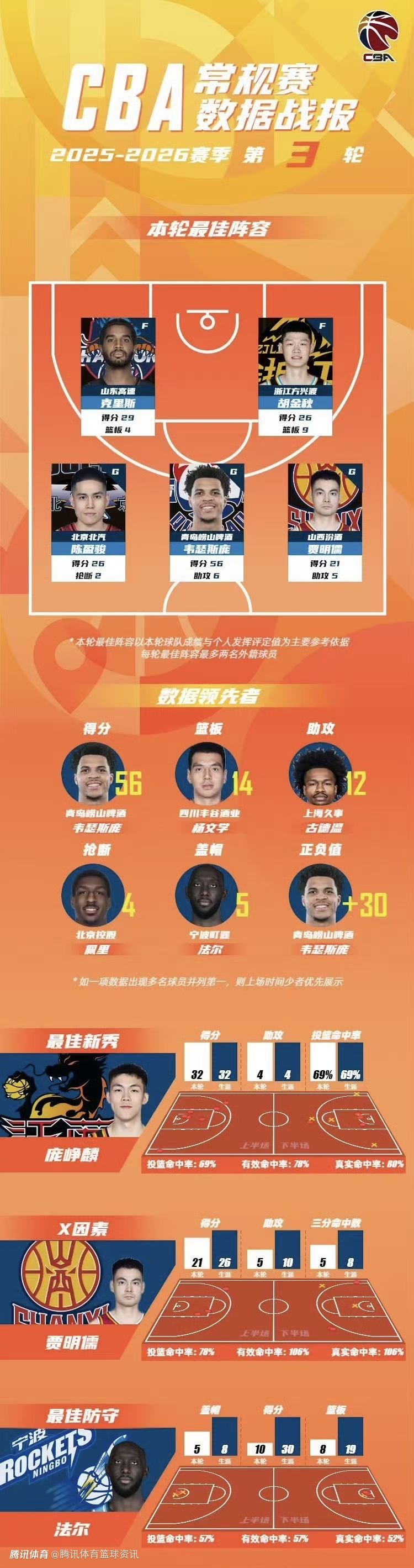 CBA公布常规赛第3轮最佳阵容:韦瑟斯庞56分6助攻领衔 胡金秋陈盈骏在列