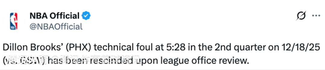 2025-12-21 01:50北京时间12月21日,NBA官方宣布,经联盟办公室审核,菲尼克斯太阳队球员狄龙-布鲁克斯在12月19日对阵金州勇士比赛中第二节5分28秒吃到的技术犯规已被撤销。