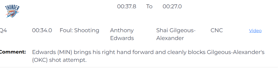 距离比赛结束还有34秒时,爱德华兹封盖亚历山大。裁判报告写道:“爱德华兹伸出右手,干净利落地封盖掉了亚历山大的出手。”这一球是成功防守,没有任何犯规。