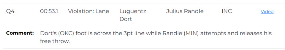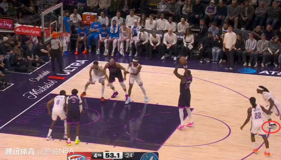 唯一的漏判发生在距离比赛结束还有53.1秒。兰德尔执行罚球并出手的瞬间,雷霆的多尔特脚已经踩在三分线上。这是一次提前进线的违例。