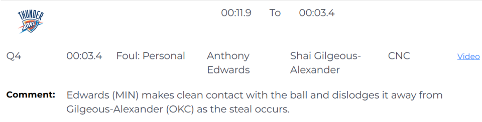 距离比赛结束还有3.4秒时,爱德华兹抢断亚历山大,彻底终结比赛悬念。裁判报告写道:“完成这次抢断时,爱德华兹干净利落地触碰到篮球,将球从亚历山大的手中抢断。”