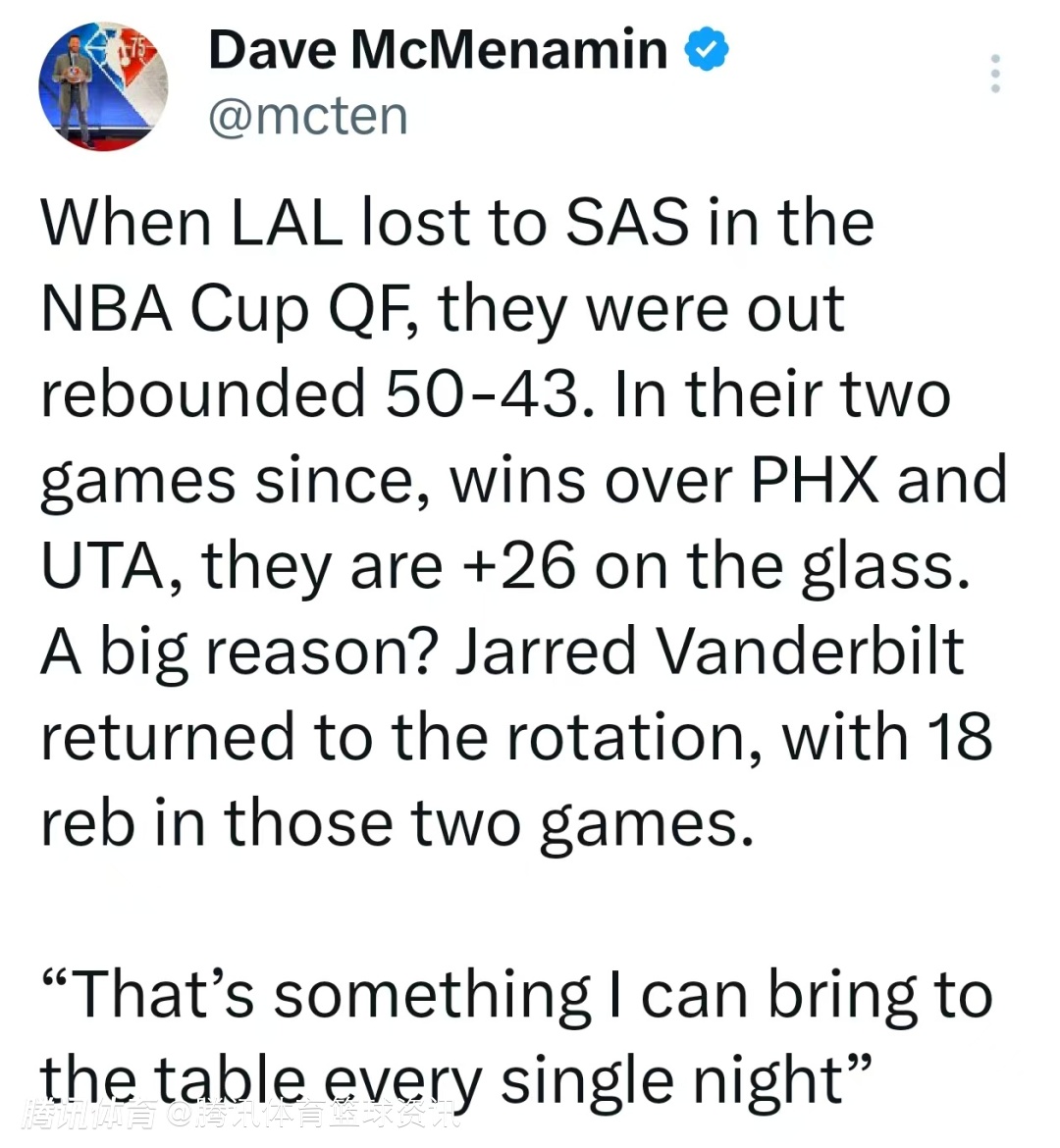 此前。湖人在NBA杯不敌马刺一役中篮板以43-50落后;此后两战击败太阳、爵士,篮板净胜26个。关键原因之一在于范德比尔特重返轮换,两战狂揽18篮板。