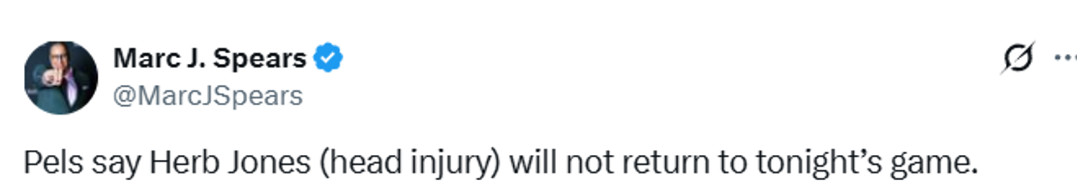 2025-12-21 10:00北京时间12月21日,NBA常规赛,鹈鹕主场对阵步行者,赫伯特-琼斯在第二节伤退,鹈鹕官方宣布,他因为头部受伤,本场比赛不会回归。